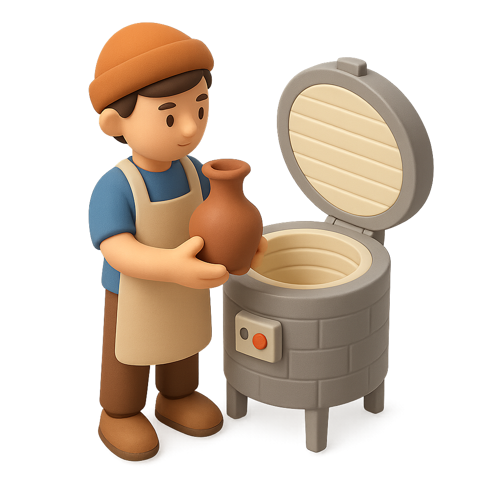 A 3D isometric icon depicting a ceramicist holding a pottery vase in front of a kiln. The character features a friendly expression, wearing an apron and a hat.