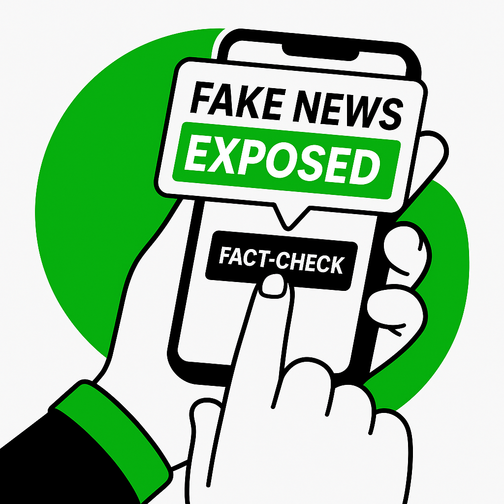 A modern illustration depicting a hand holding a smartphone displaying a message about fact-checking fake news. The design combines bold colors and flat graphics, ideal for educational content on media literacy.