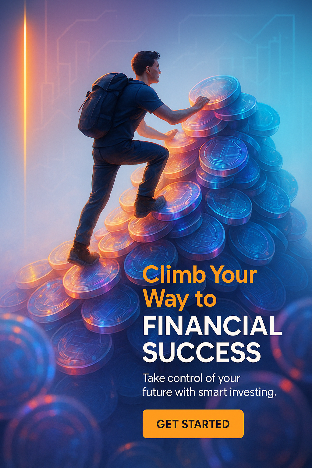 Dynamic graphic illustrating the journey to financial success with a person climbing a stack of coins, ideal for investment-related marketing and motivational content.