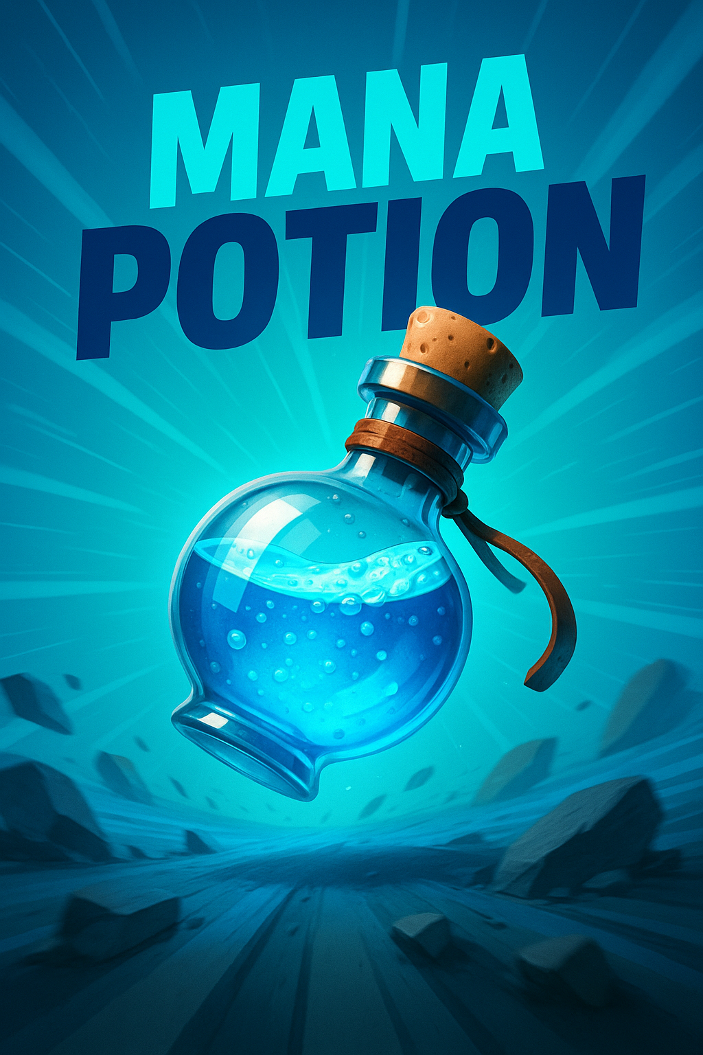 /Collection: /by davooda/Type: PNG/A vibrant illustration of a mana potion in a glass bottle, surrounded by dynamic blue rays. The title 'MANA POTION' is prominently displayed in bold font, enhancing the energetic feel.