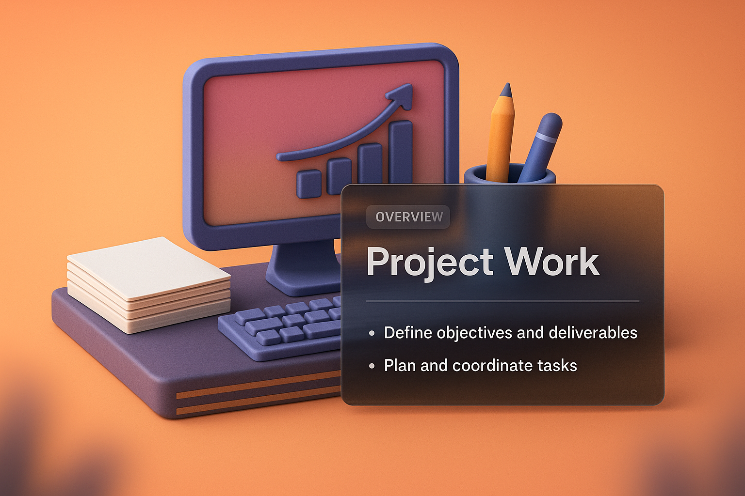 /Collection: /by davooda/Type: PNG/A vibrant 3D illustration showcasing a computer setup with creative design elements. Features a dark transparent overlay with project work details, enhancing visual appeal.
