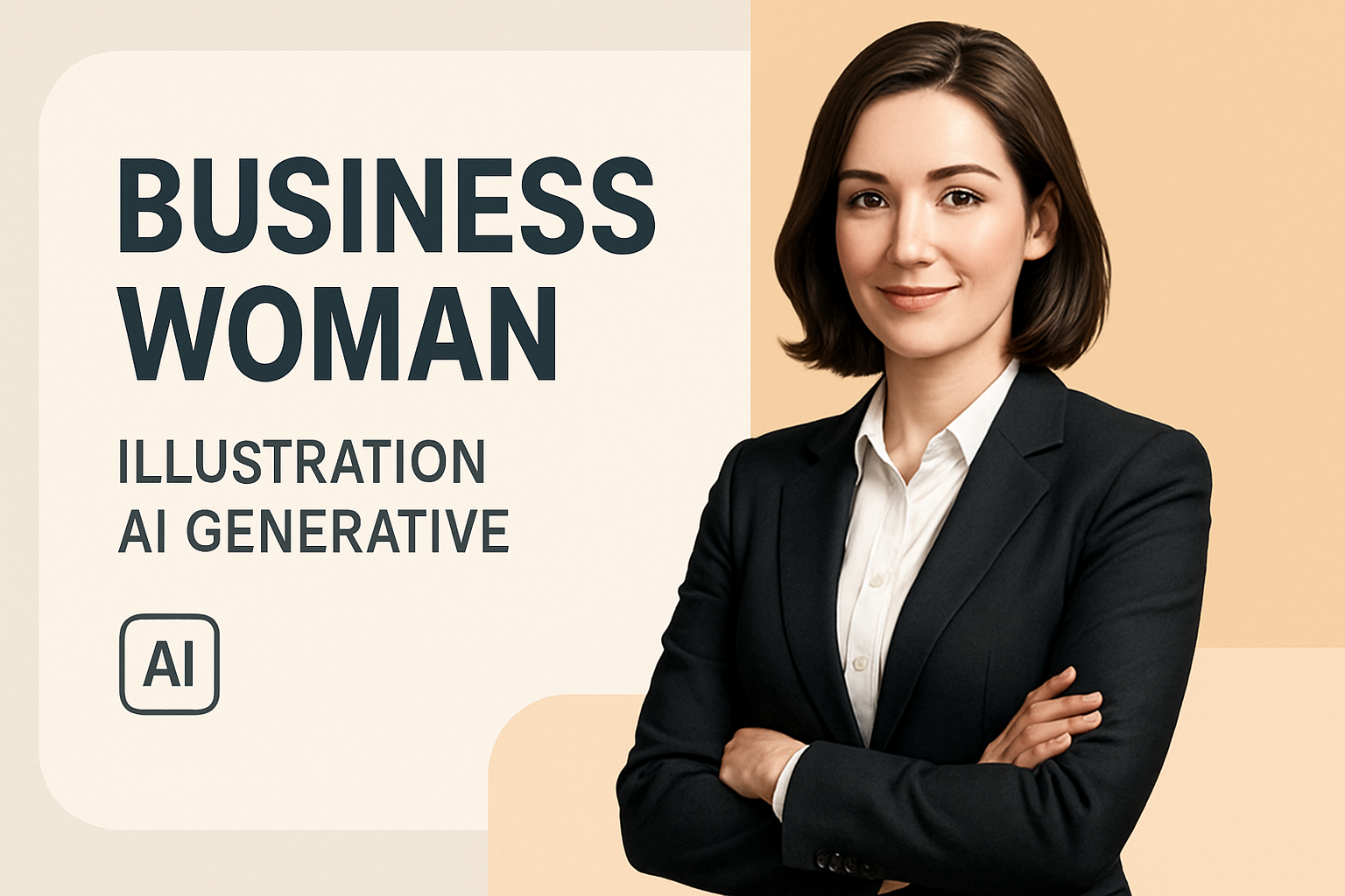 /Collection: /by davooda/Type: PNG/A well-lit, realistic illustration of a business woman, set against a bright, geometric background. The design features bold typography and a balanced layout, emphasizing professionalism.