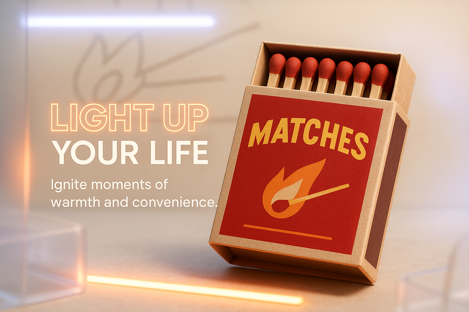 /Collection: /by davooda/Type: PNG/Stylish promotional graphic featuring a matchbox with a modern design, symbolizing warmth and convenience, ideal for lifestyle branding or product marketing.