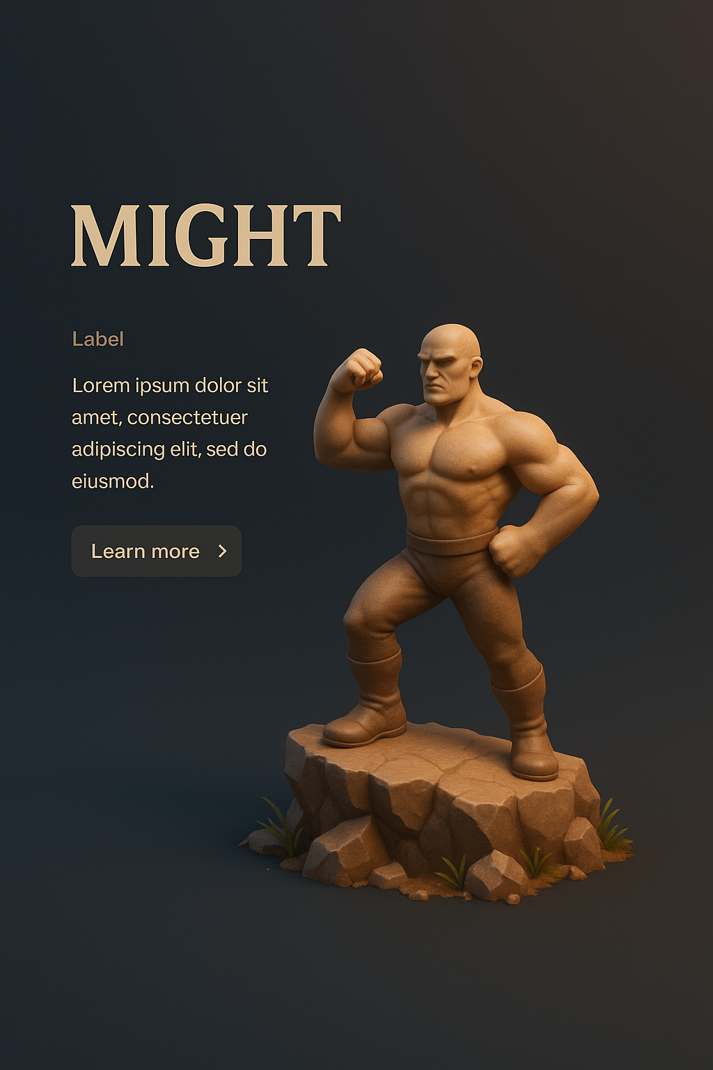 A zoomed-out 3D scene featuring a muscular figure representing 'Might', set against a dark gradient background. The design includes a label, a brief text block, and a call-to-action button.