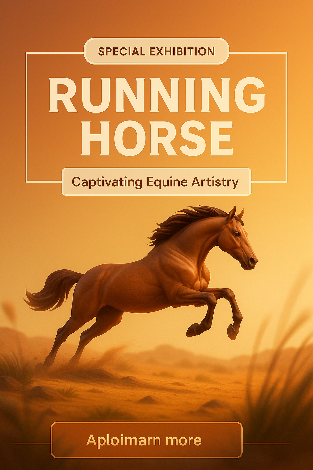 This vibrant banner showcases a running horse against a warm, sandy background, promoting a special exhibition. It features bold typography and an artistic style suited for art enthusiasts.