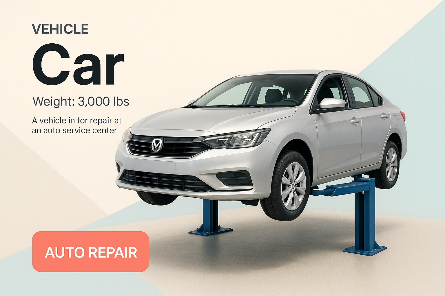 /Collection: /by davooda/Type: PNG/A sleek car in an auto repair shop, showcased on a lift with a modern promotional design. The image features a dynamic background and bold typography emphasizing the vehicle's weight and service.