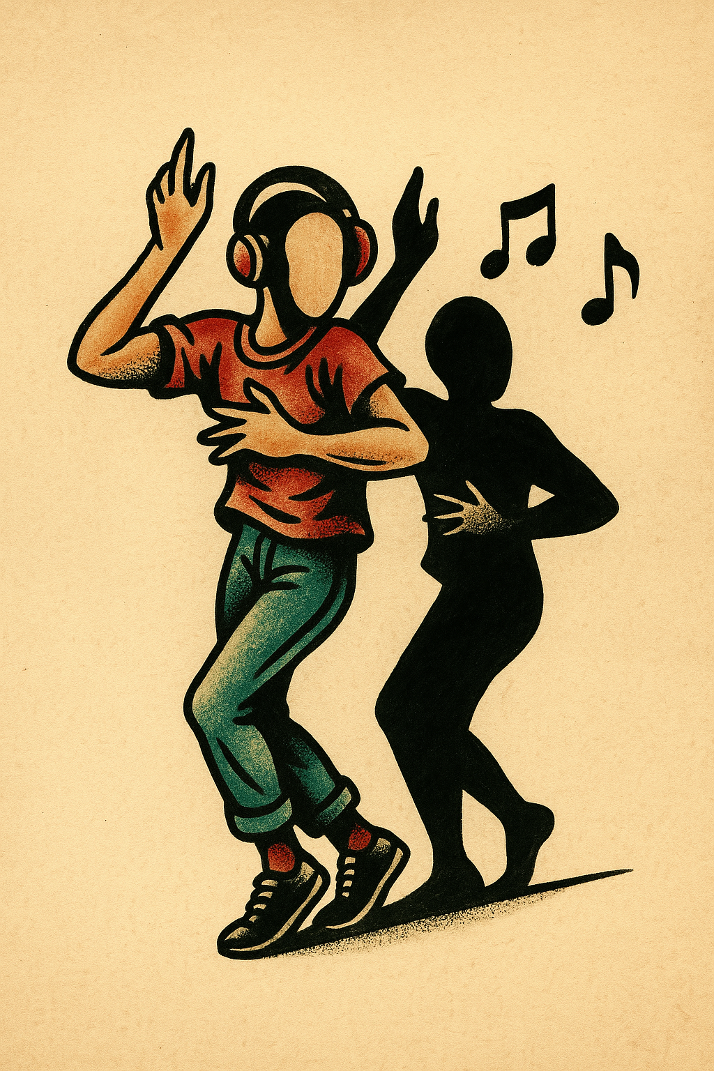 /Collection: /by davooda/Type: PNG/An artistic tattoo design depicting a person dancing with a shadow. The figure wears headphones and moves to the rhythm, highlighted against a beige background.