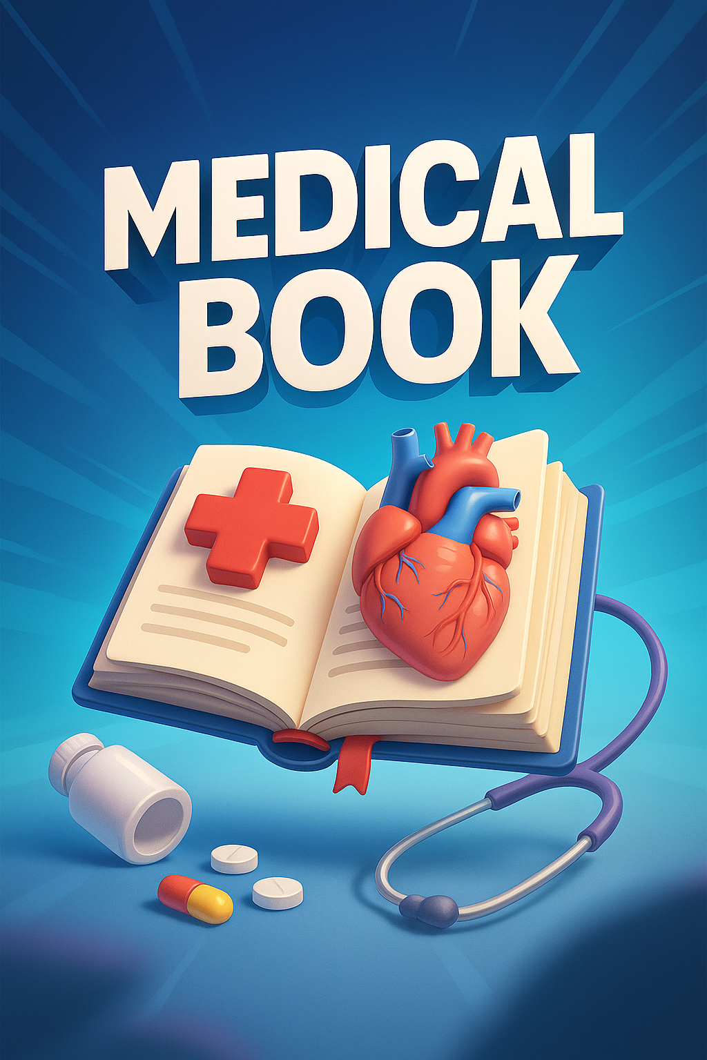 /Collection: /by davooda/Type: PNG/A vibrant 3D illustration of an open medical book featuring a heart and medical symbols, set against a dynamic gradient background. The design emphasizes a professional yet engaging aesthetic.