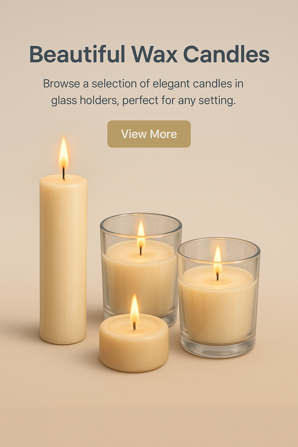 A stunning presentation of elegant wax candles in various glass holders. The design features soft colors, a smooth gradient background, and a clear action button for interaction.