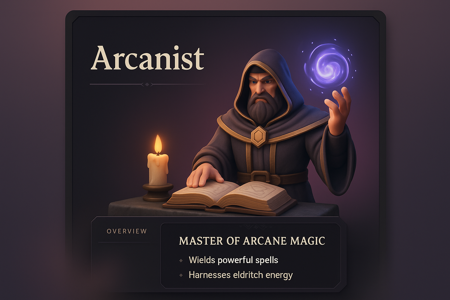 A captivating 3D illustration of an arcanist wielding arcane magic. The character is depicted with a candle and an open book, showcasing a mystical energy orb.