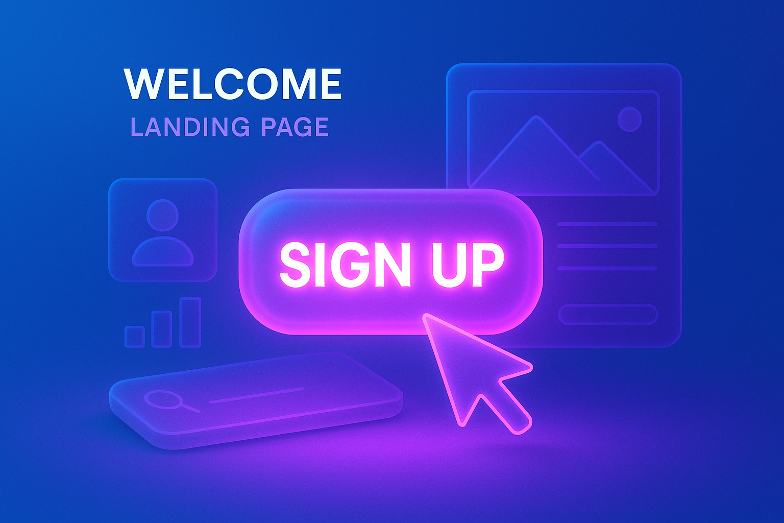 A vibrant landing page design featuring a glowing 'SIGN UP' button with a neon pink hue. The background is a solid blue color, enhancing the luminous atmosphere.