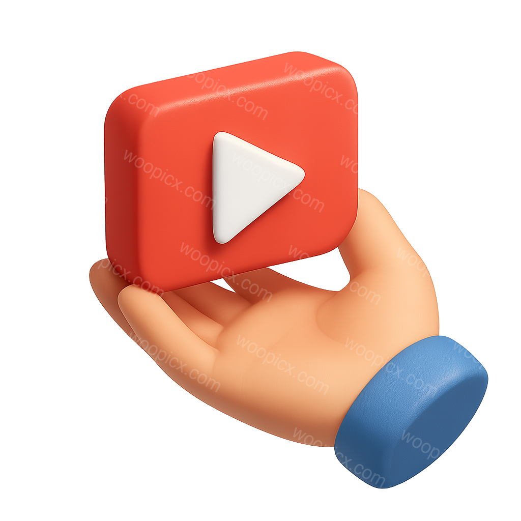 A stylized 3D icon featuring a hand holding a red play button. The button has a white triangular play symbol, presented in a three-quarter view with a soft, volumetric appearance.