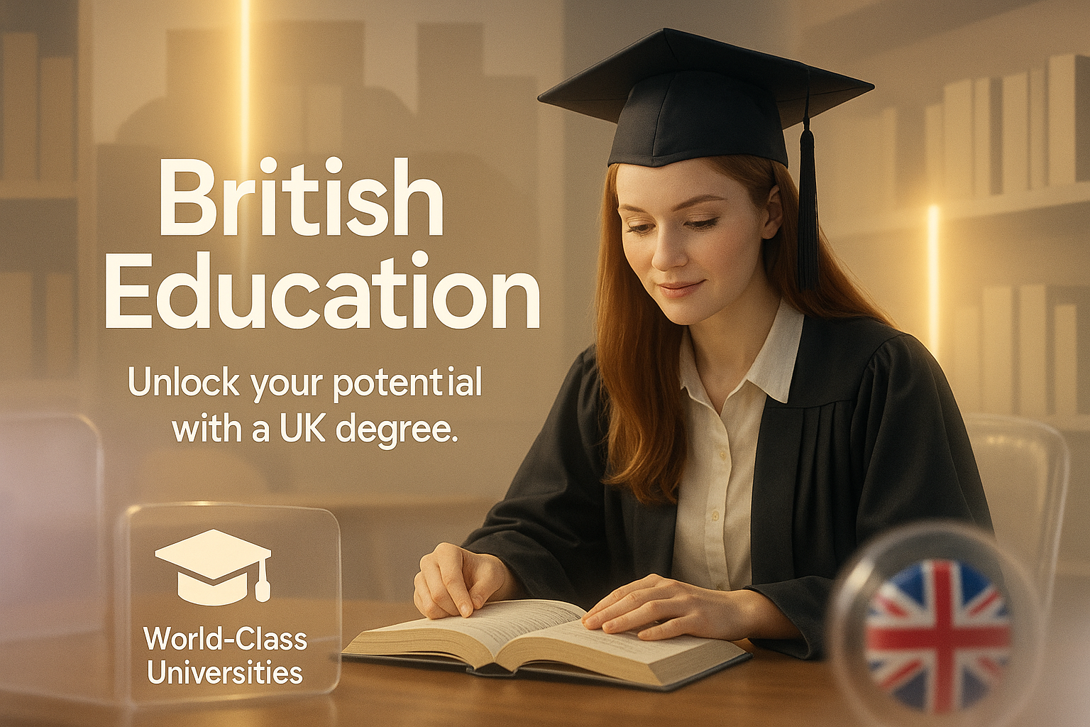 Visually engaging promotional image highlighting the benefits of British education, featuring a graduate in a cap and gown, ideal for educational marketing.