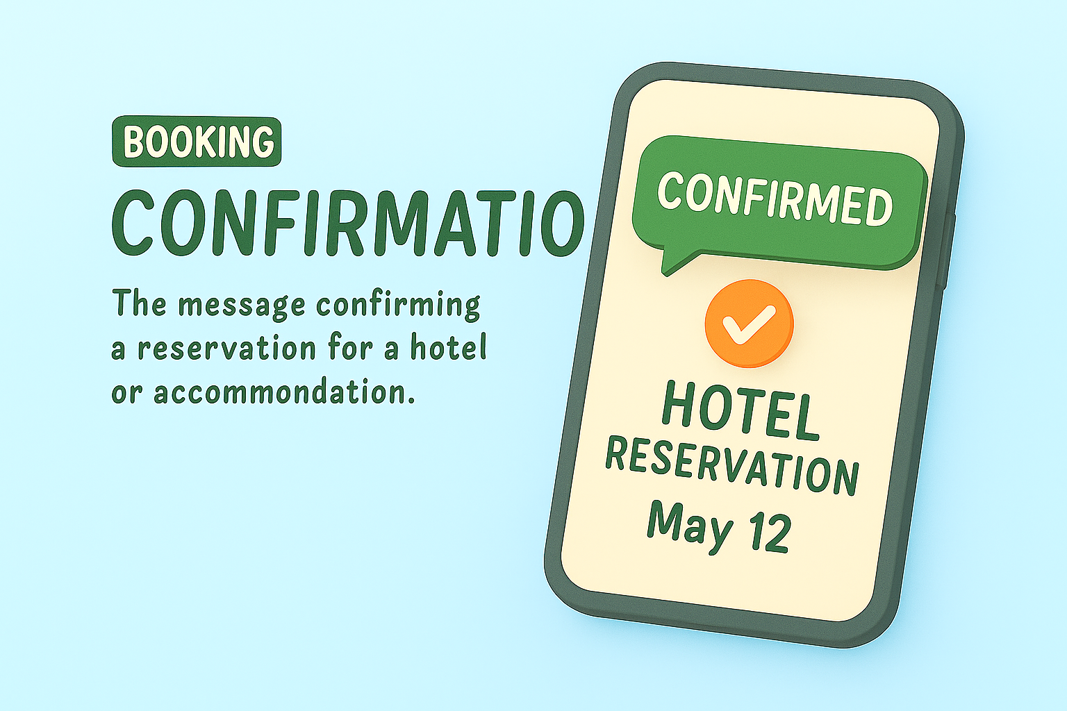 Informative graphic illustrating a digital hotel booking confirmation on a smartphone, designed with a modern and clean aesthetic, suitable for travel-related websites or apps.