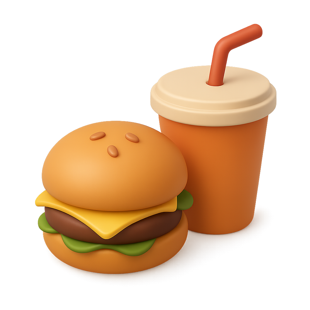 A vibrant 3D icon depicting a burger with cheese and a drink cup with a straw, designed in an isometric style with a transparent background.