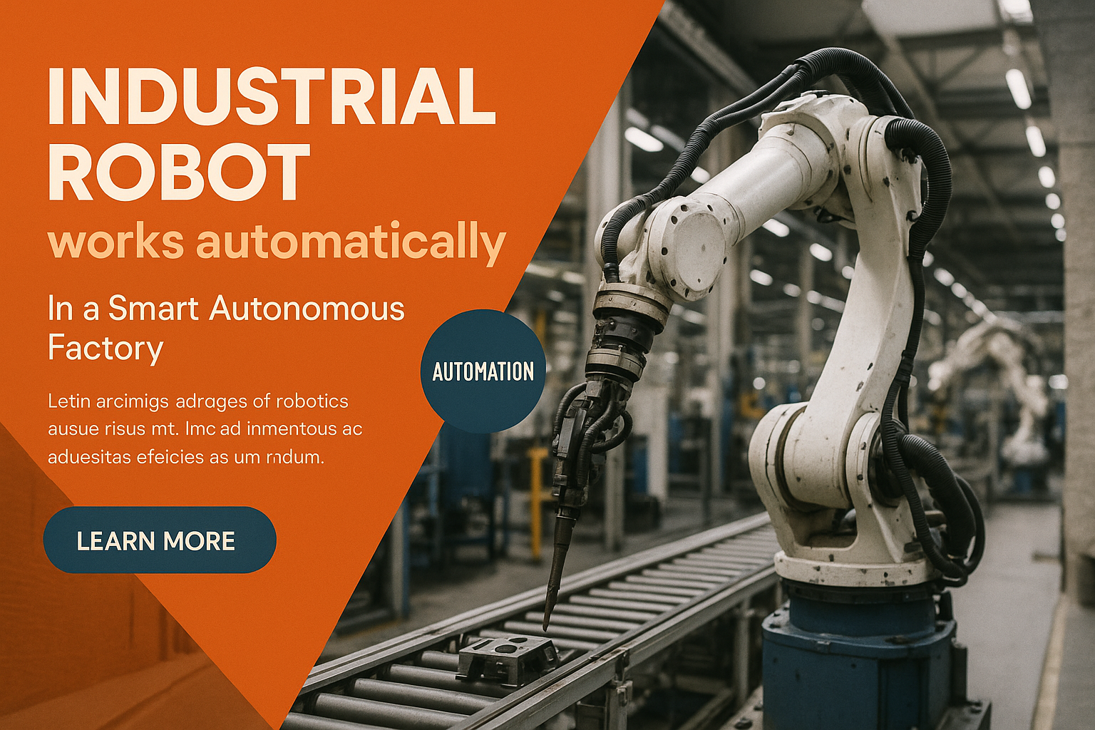 A detailed illustration of an industrial robot working in a smart autonomous factory environment, featuring vibrant colors and clear text elements.