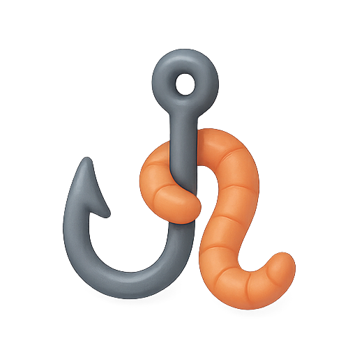 A stylized graphic of a fishing hook with a worm wrapped around it. The design features a modern and playful aesthetic, suitable for fishing-related content or branding.