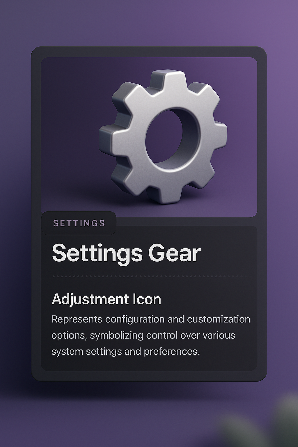 /Collection: /by davooda/Type: PNG/A sleek 3D illustration of a settings gear icon set against a smooth gradient background, featuring a stylish dark panel with descriptive text and integrated design elements.