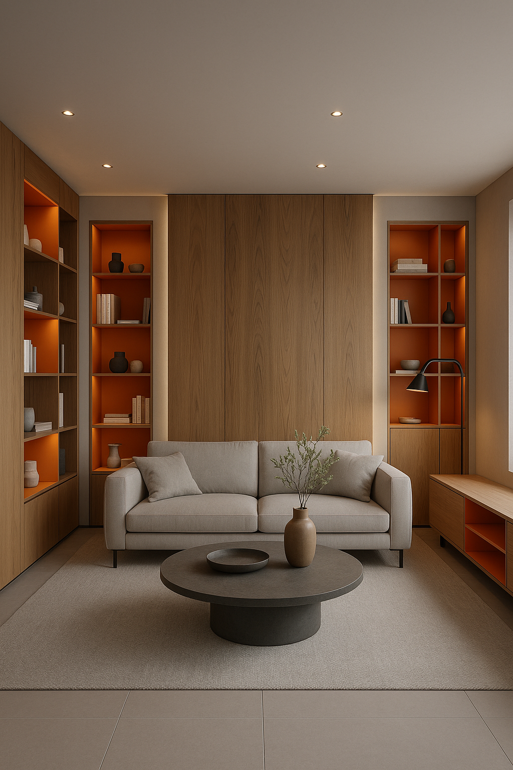 /Collection: /by davooda/Type: PNG/A stylish modern minimalist living room featuring elegant wooden walls, soft lighting, and a neutral color palette. The space includes a cozy sofa, a round coffee table, and decorative shelves with warm orange interiors.