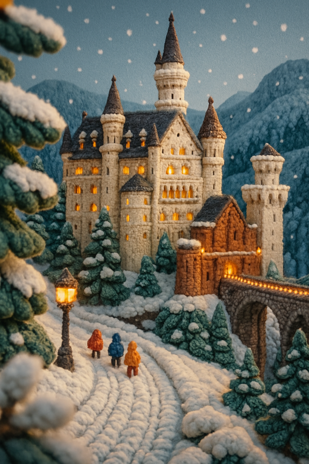 A cozy, knitted depiction of Neuschwanstein Castle surrounded by snow-laden trees. The scene features soft textures, glowing windows, and tiny figures walking in a festive atmosphere.