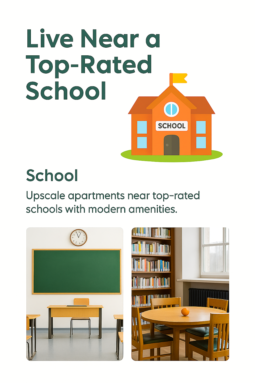 /Collection: /by davooda/Type: PNG/Engaging promotional graphic highlighting upscale apartments located near top-rated schools, featuring modern design elements suitable for real estate marketing.