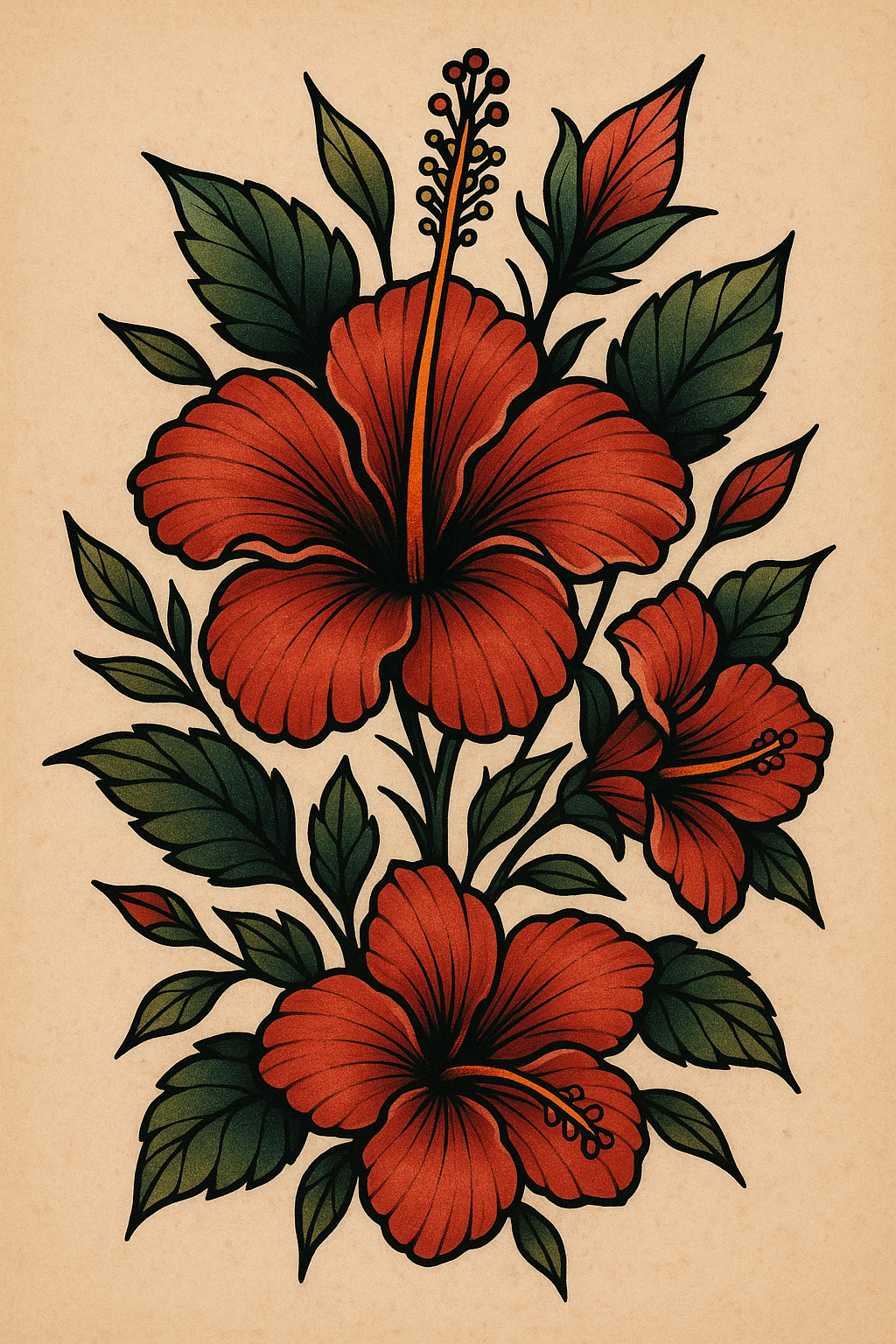 This image showcases a vibrant illustration of hibiscus flowers with bold colors and intricate details, perfect for decorative purposes or botanical themes.