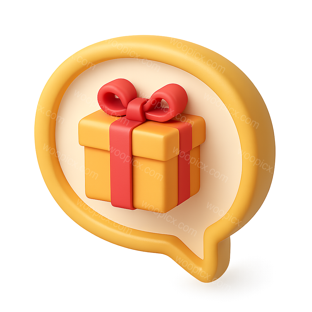 A visually striking 3D icon of a gift box with a red ribbon, nestled inside a yellow speech bubble. The design features a three-quarter view, creating a volumetric feel.