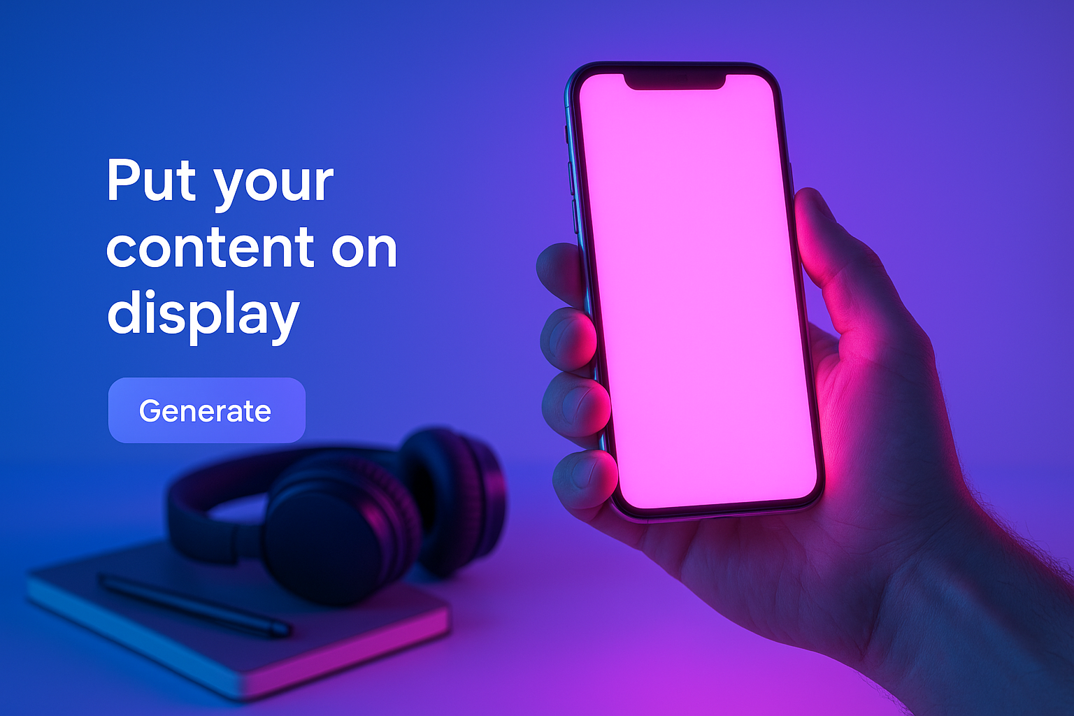 A hand holds a phone glowing in neon pink, surrounded by headphones and a notebook. The scene is illuminated with cool shades of blue and violet, creating a striking atmosphere.