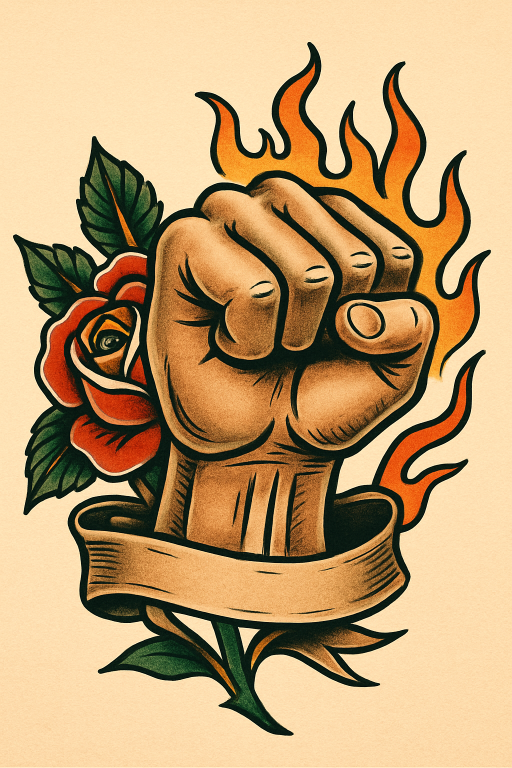 This image features a bold tattoo design of a raised fist entwined with a rose and flames, embodying themes of strength and passion. Ideal for tattoo enthusiasts and artists.