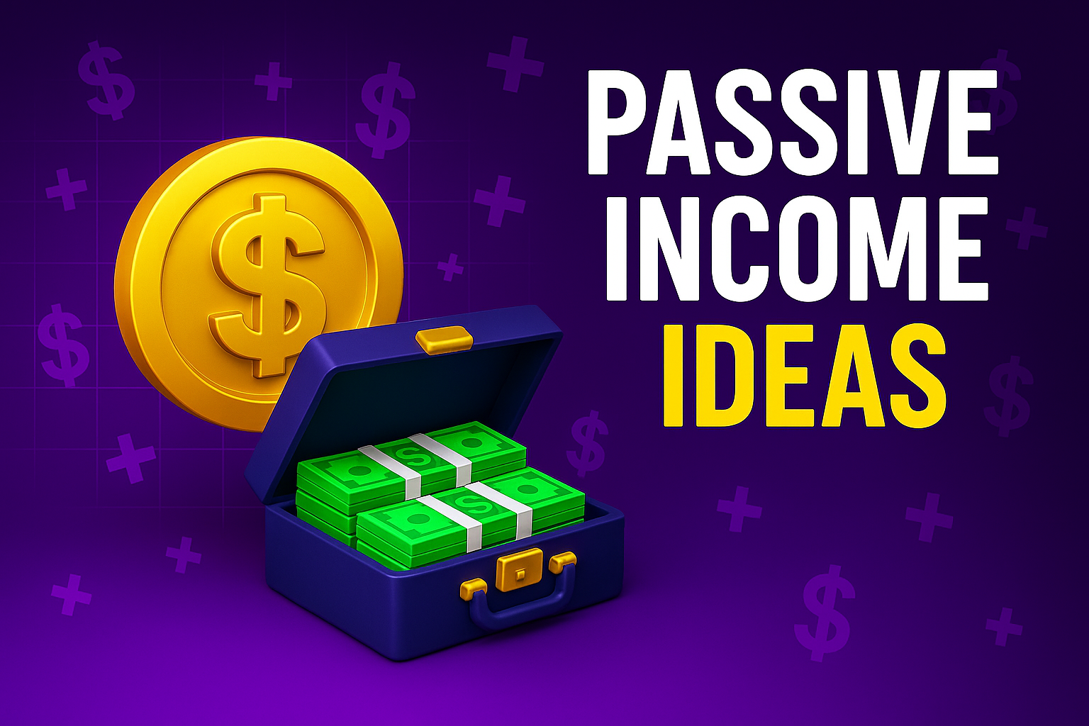 Vibrant graphic featuring a treasure chest filled with cash and a gold coin, illustrating the theme of passive income ideas. Suitable for financial blogs or social media posts.