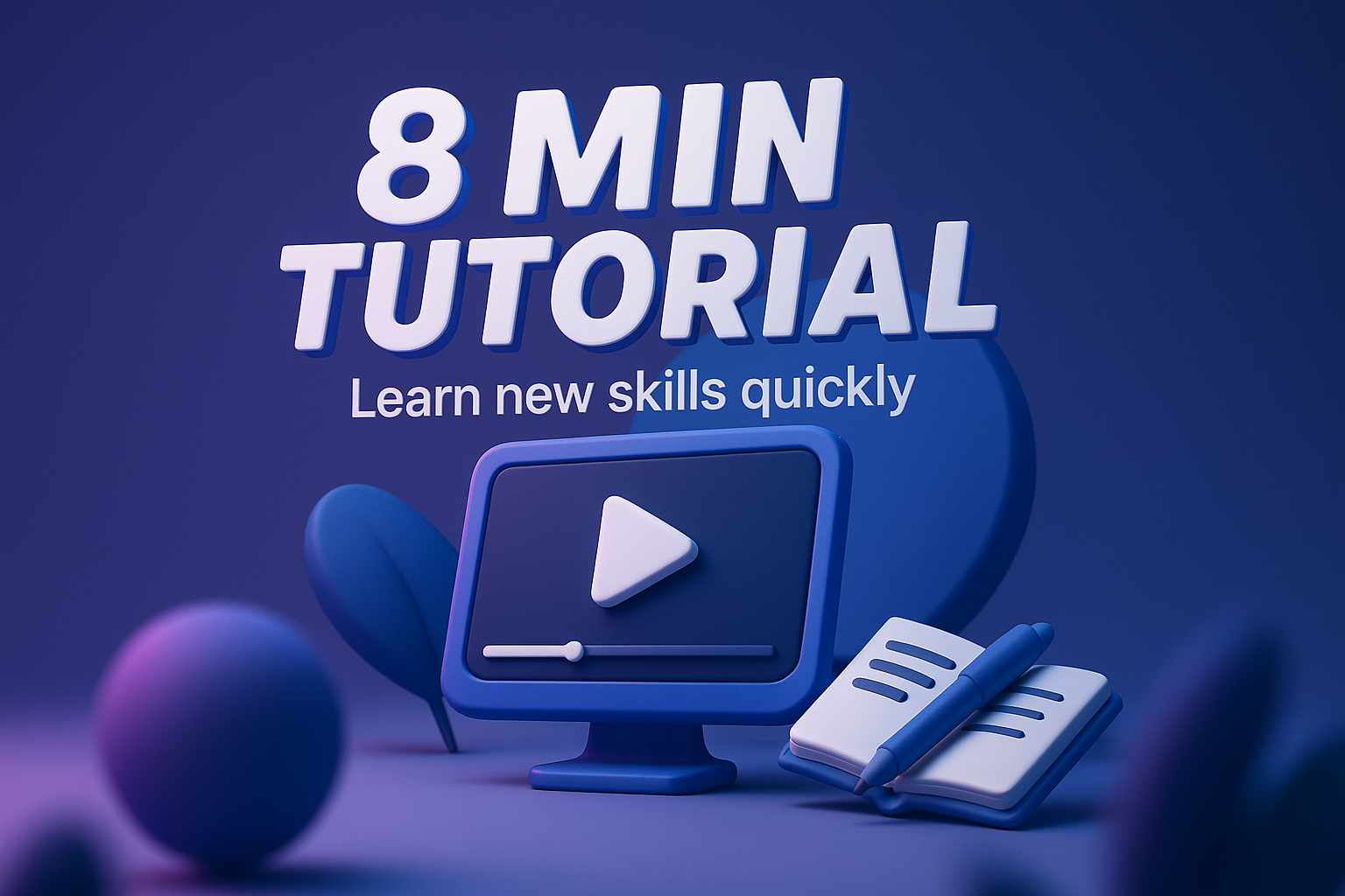 A visually striking 3D graphic showcasing a tutorial theme. It features a computer monitor with a play button, conveying a modern educational concept aimed at quick learning.