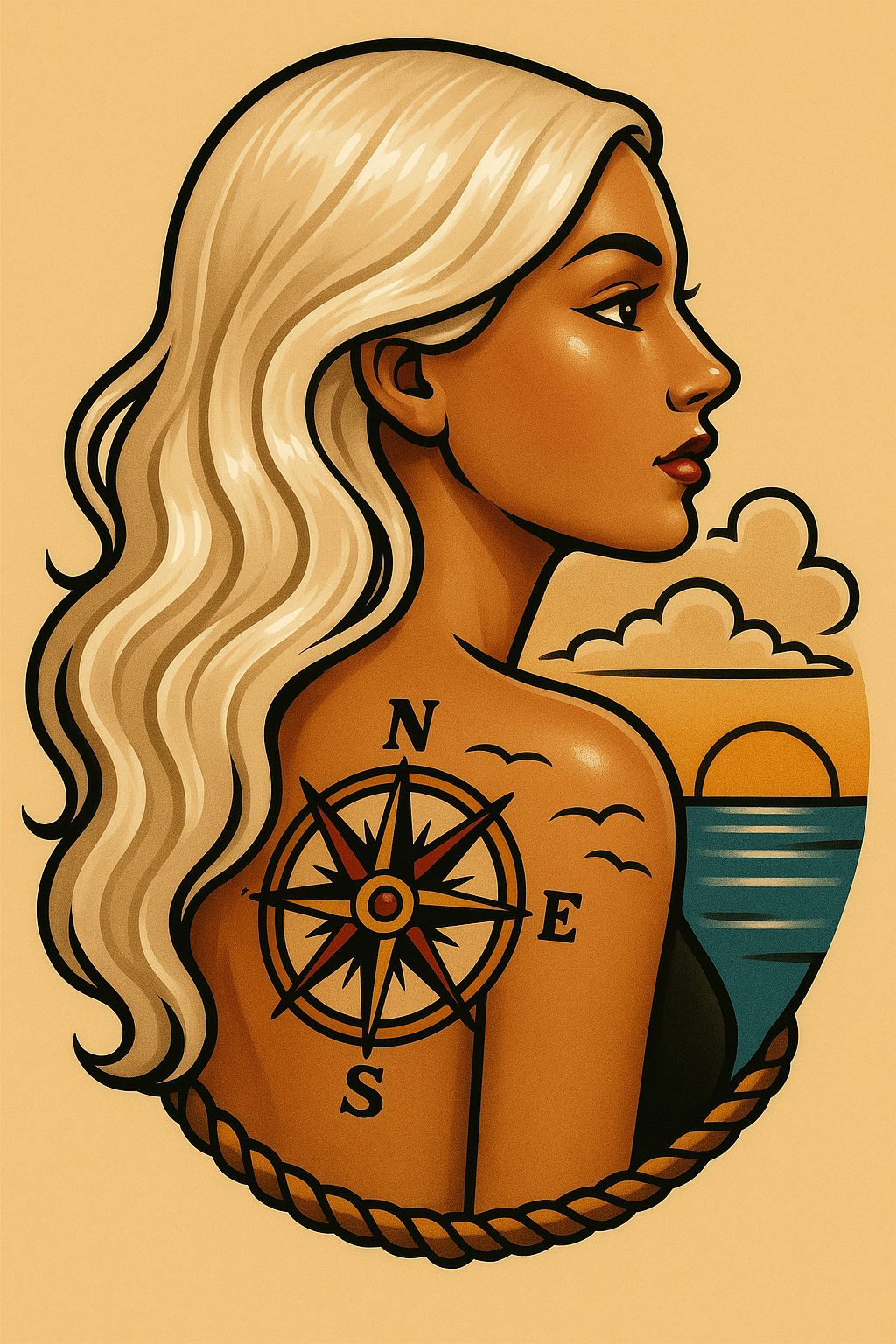 A beautifully stylized illustration of a woman with white hair, showcasing a compass tattoo on her back. The background features a serene sunset over the ocean, enhancing the artistic composition.