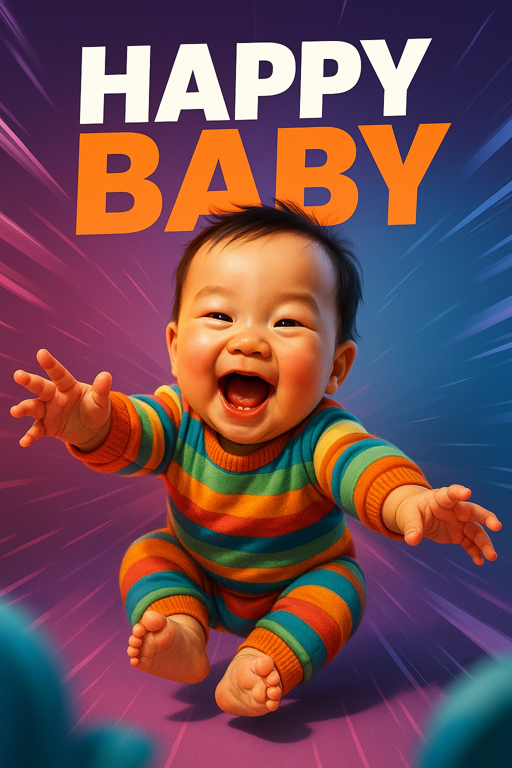 /Collection: /by davooda/Type: PNG/A cheerful Asian baby wearing a colorful striped outfit is joyfully reaching out, set against a dynamic gradient background. The scene is vibrant and engaging, capturing the essence of happiness.