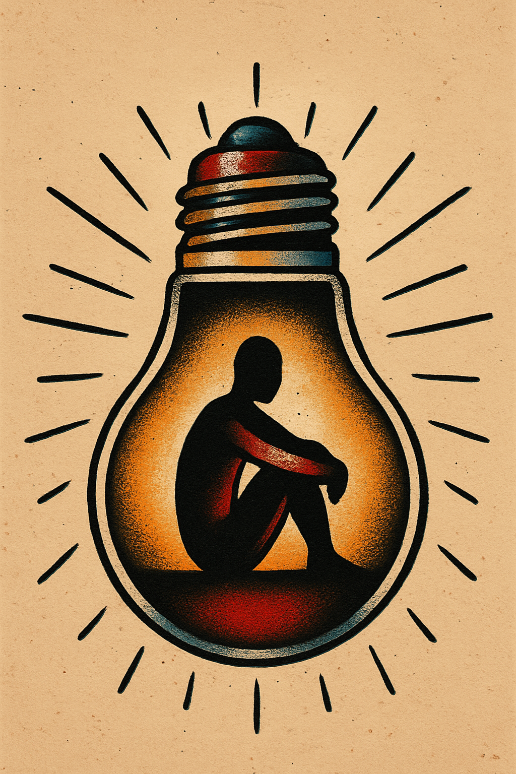 A creative tattoo design featuring a silhouette of a person sitting inside a light bulb. The artwork is colorful against a light beige background, emphasizing the intricate details.