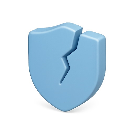 A 3D-rendered blue shield icon with a crack, symbolizing a security breach or vulnerability. Ideal for cybersecurity or protection-related content.