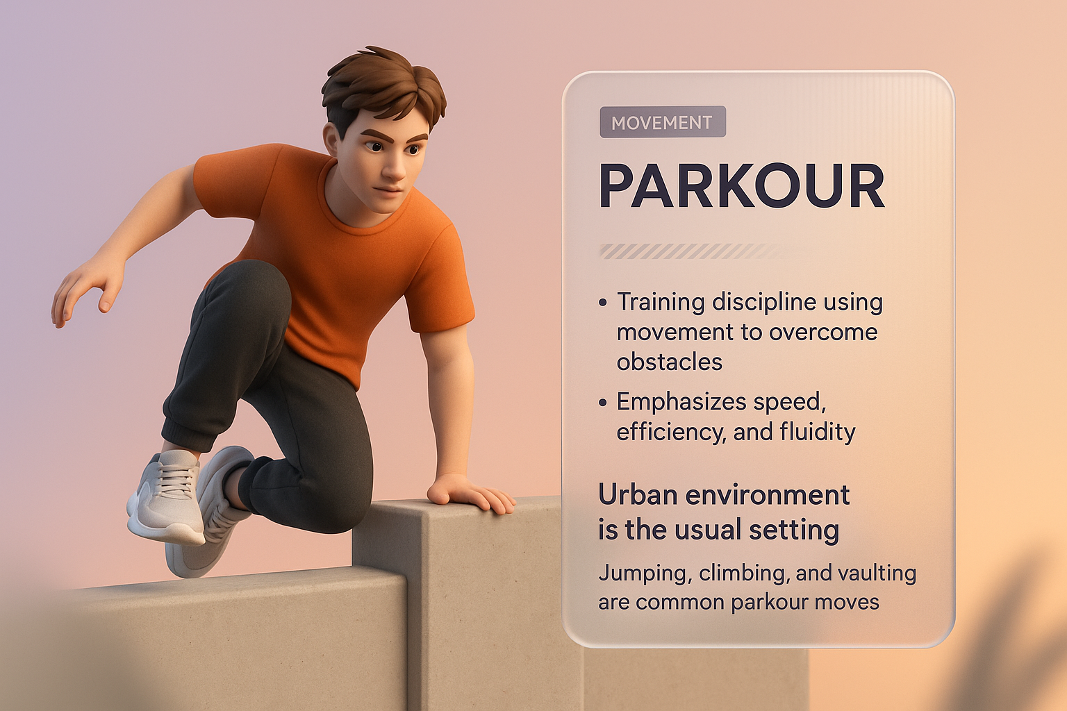 A 3D illustration of a person practicing parkour, featuring a smooth gradient background. The design includes a transparent glass-like panel with text, enhancing the theme of movement and agility.