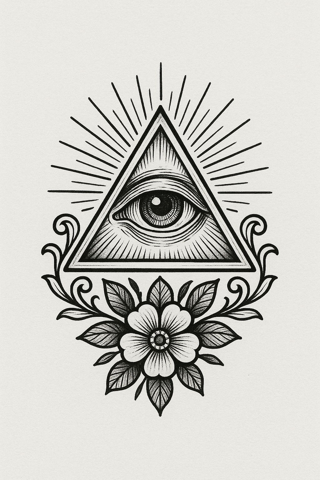 /Collection: /by davooda/Type: PNG/This is a detailed black and white illustration featuring an eye enclosed in a triangle, surrounded by ornate floral designs. It can be used for tattoos or artistic prints.