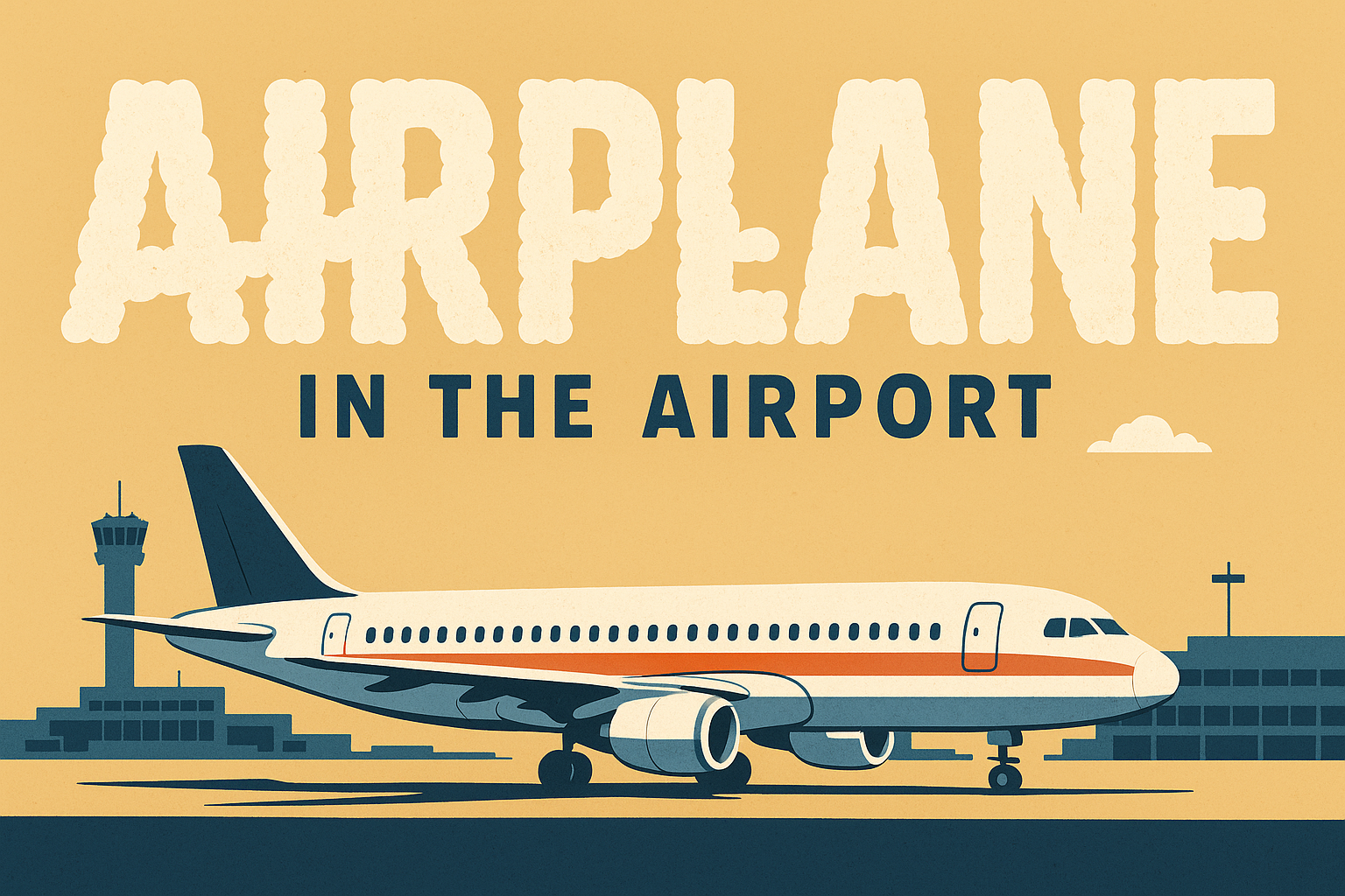 Stylized Illustration of Airplane at Airport with Bold Typography