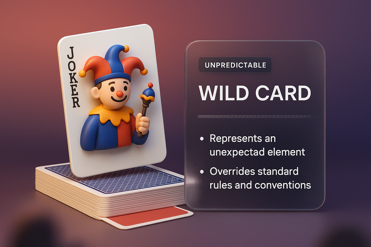 /Collection: /by davooda/Type: PNG/A vibrant 3D illustration featuring a joker card, symbolizing unpredictability. Accompanied by a dark, transparent panel that integrates seamlessly, showcasing key content.