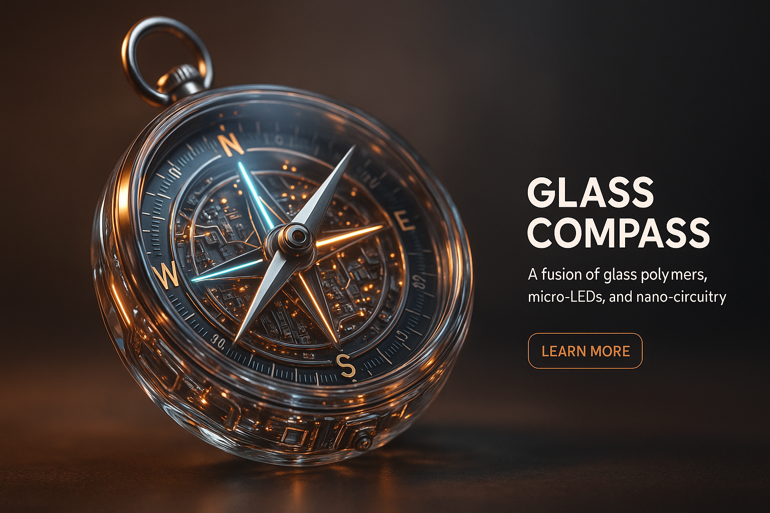 /Collection: /by davooda/Type: PNG/A stunning close-up of a glass compass showcasing intricate micro-LEDs and circuit boards. Its reflective surface emits a warm glow, enhanced by stylish neon lighting.