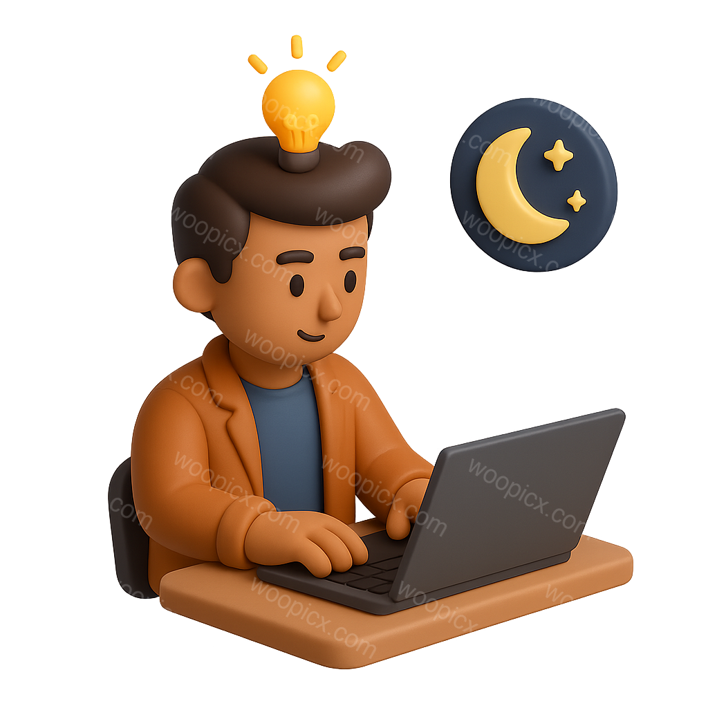 /Premium/Collection: /by davooda/Type: PNG/A 3D icon depicting a founder working on a laptop during a hackathon. The character has a lightbulb above their head, symbolizing creativity, and is focused on their task.
