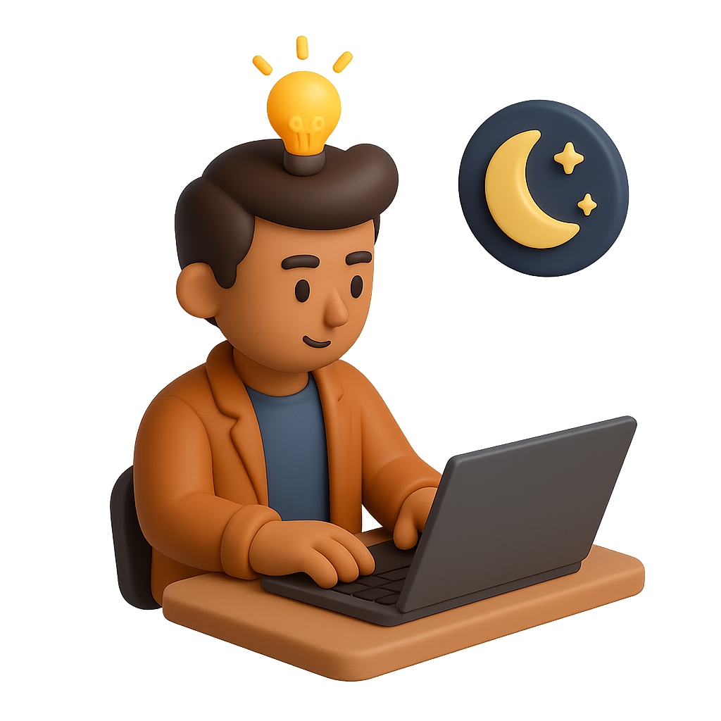 /Collection: /by davooda/Type: PNG/A 3D icon depicting a founder working on a laptop during a hackathon. The character has a lightbulb above their head, symbolizing creativity, and is focused on their task.