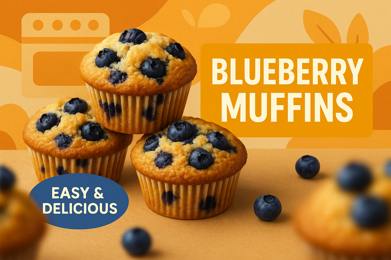 A vibrant promotional image featuring freshly baked blueberry muffins, set against a warm background. Ideal for food blogs or recipe sharing.