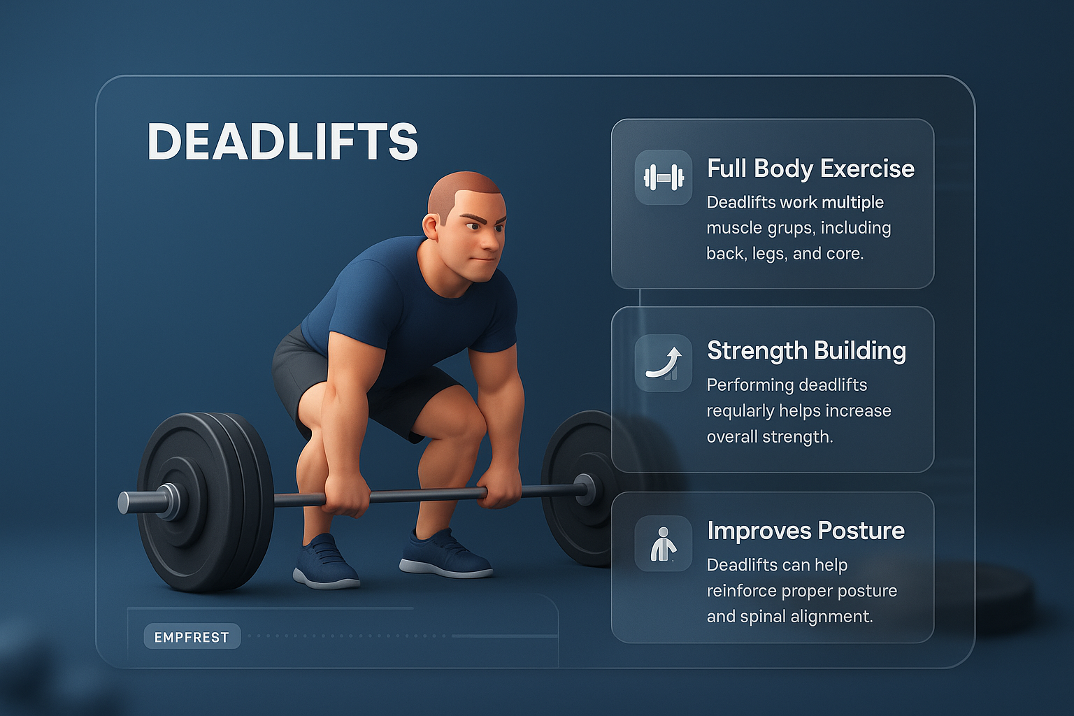 /Collection: /by davooda/Type: PNG/A 3D illustration of a man performing deadlifts, accompanied by informative blocks detailing benefits like strength building and posture improvement. The design features a smooth gradient background and a cohesive layout.