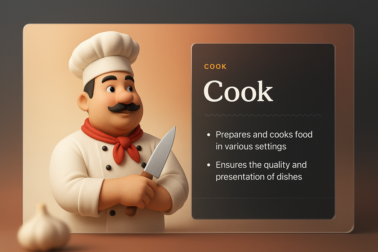 /Collection: /by davooda/Type: PNG/A 3D illustration of a cook holding a knife, featuring integrated design elements like a dark transparent panel with text, emphasizing culinary skills and food presentation.