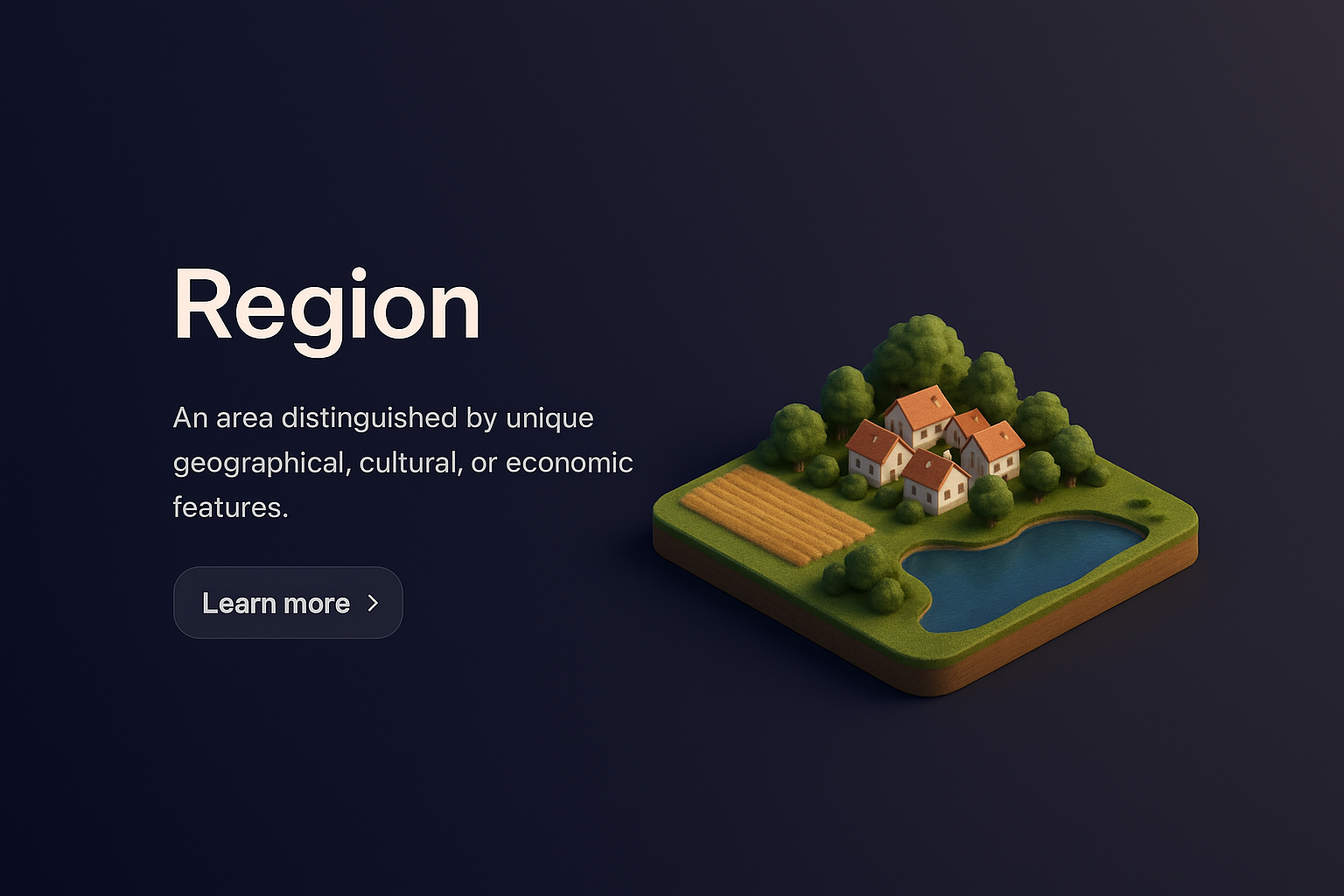 /Collection: /by davooda/Type: PNG/A beautifully crafted 3D scene depicting a small, charming region with houses, fields, and a pond, set against a dark gradient background. The design features clear text and a button for interactivity.