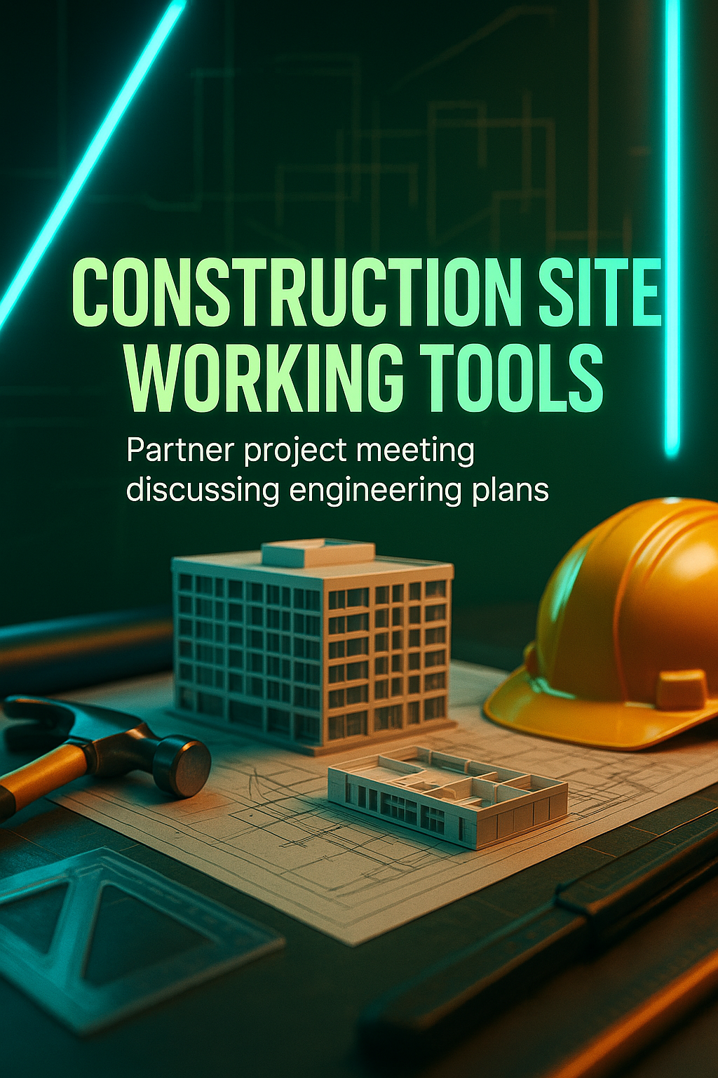 /Collection: /by davooda/Type: PNG/A visually striking graphic featuring a 3D render of construction tools and plans, ideal for presentations or project meetings in the engineering field.