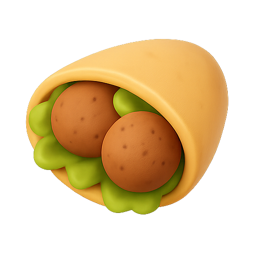Vibrant 3D graphic of a food wrap containing meatballs and fresh vegetables, ideal for food-related content, menus, or culinary promotions.
