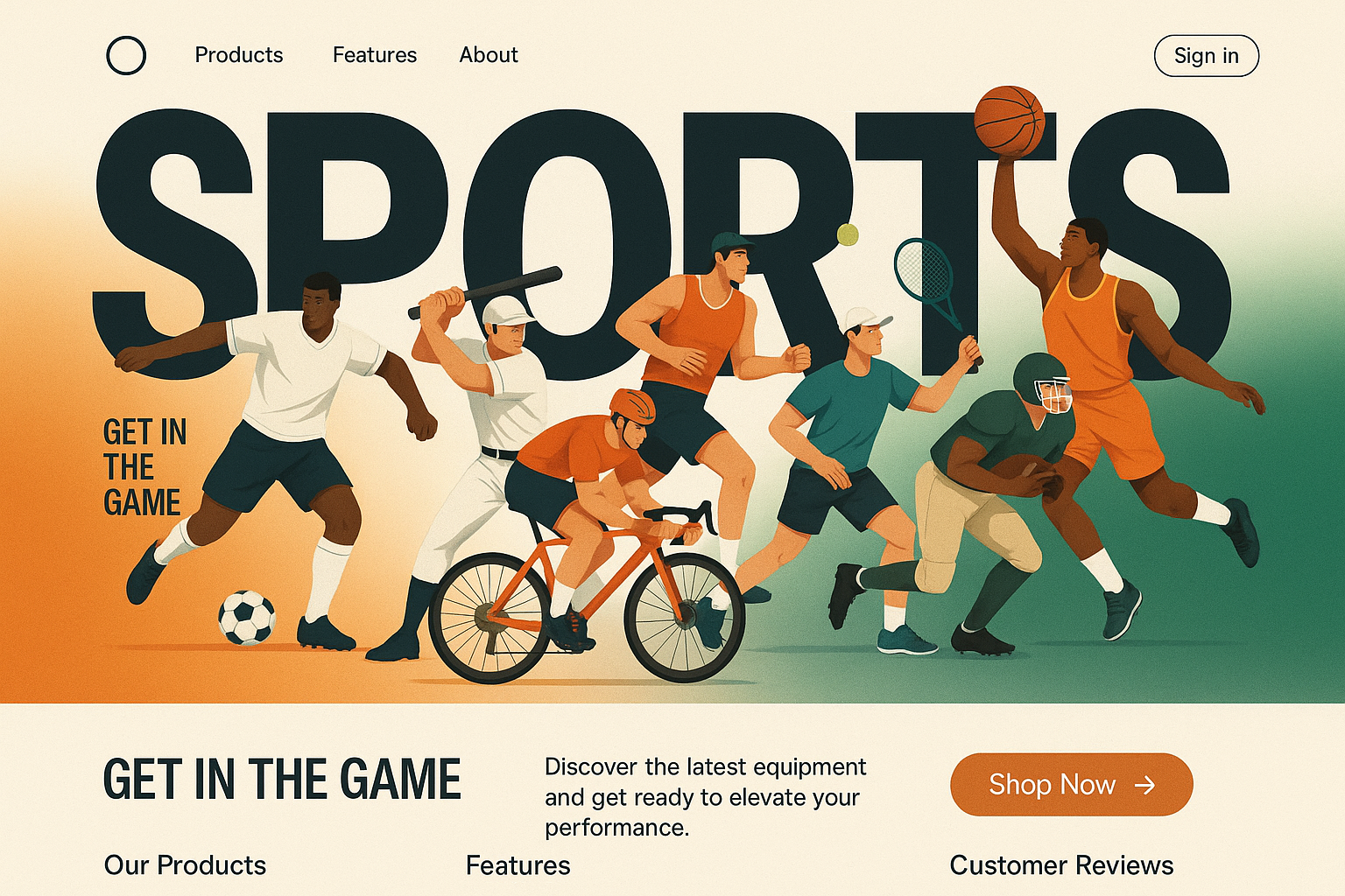 /Collection: /by davooda/Type: PNG/A vibrant landing page design featuring various sports players in action. The bold typography and minimalistic layout create a modern aesthetic, highlighting the sports theme.