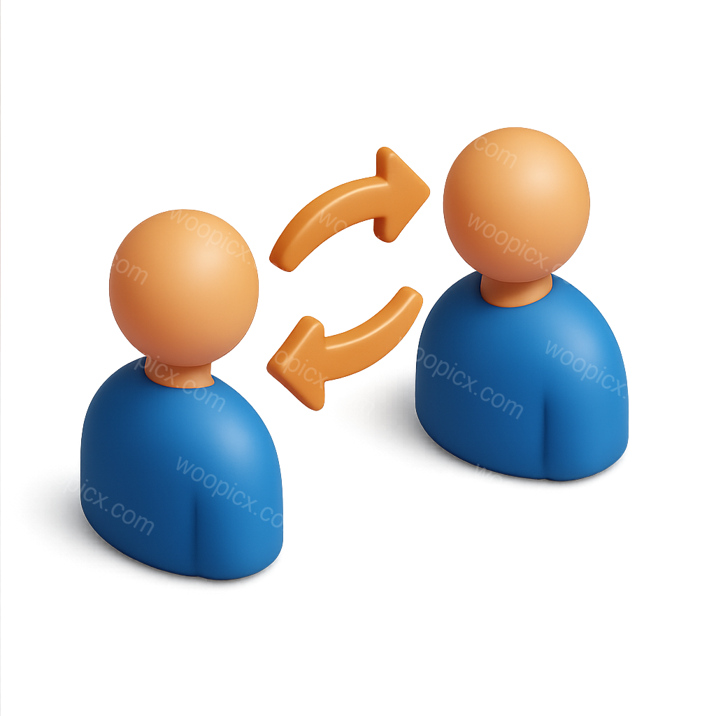 /Premium/Collection: /by davooda/Type: PNG/This image features two stylized 3D figures facing each other, each with a rounded head and a blue body. Arrows connect them, suggesting interaction. The design is isometric and volumetric with a transparent background.